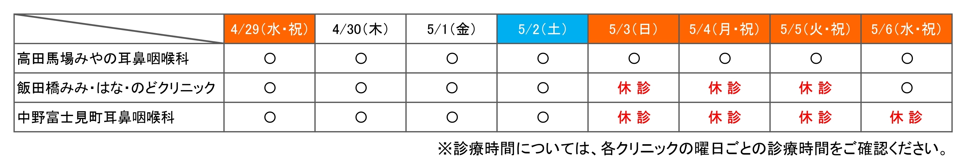 ゴールデンウィーク期間中の診療スケジュールは下記のとおりです。